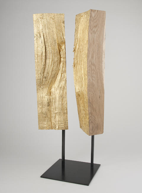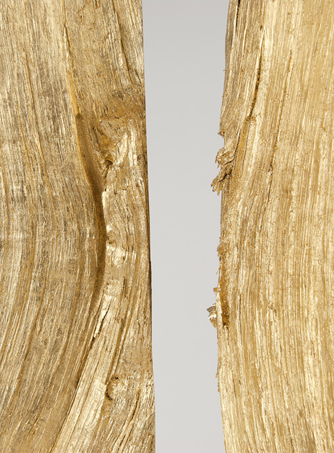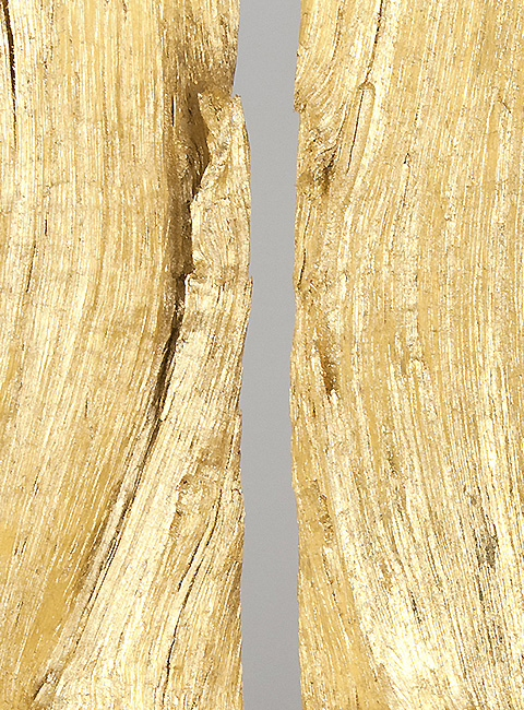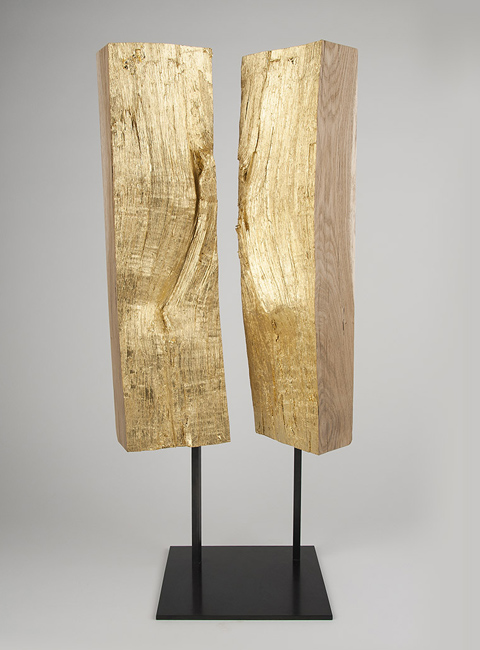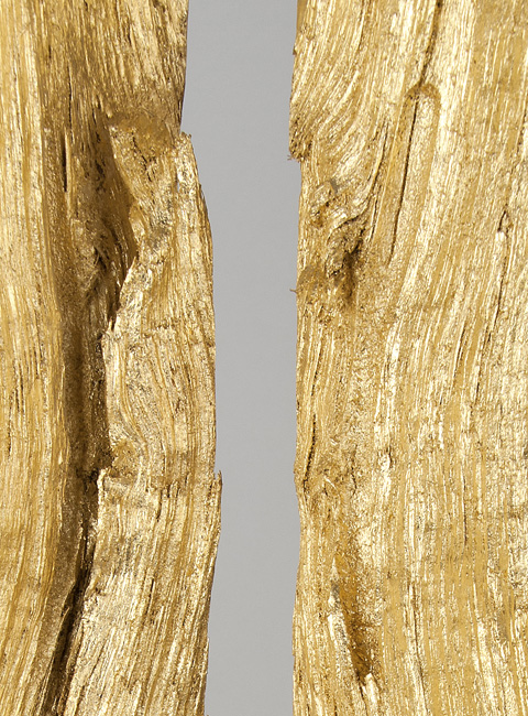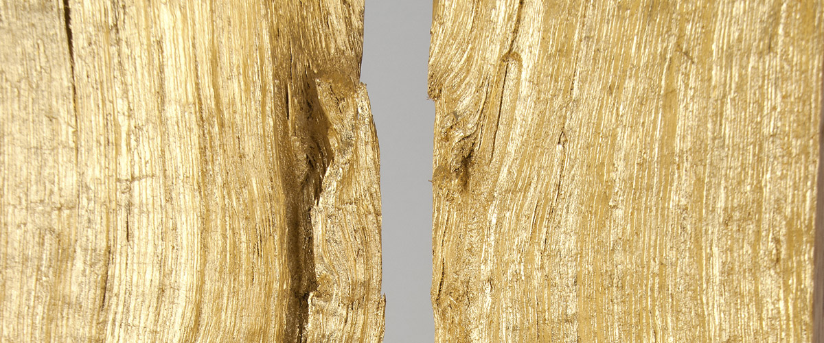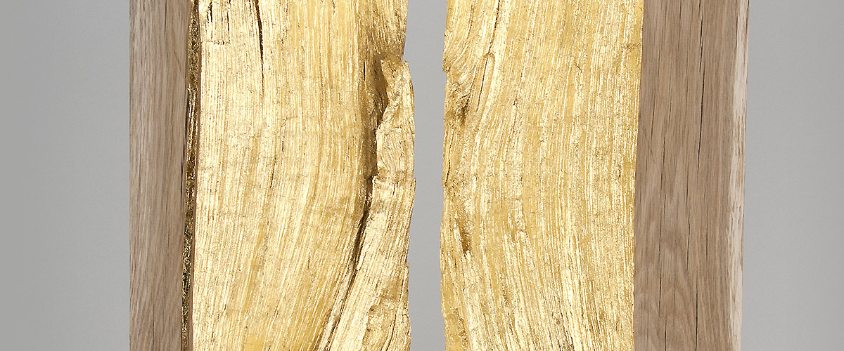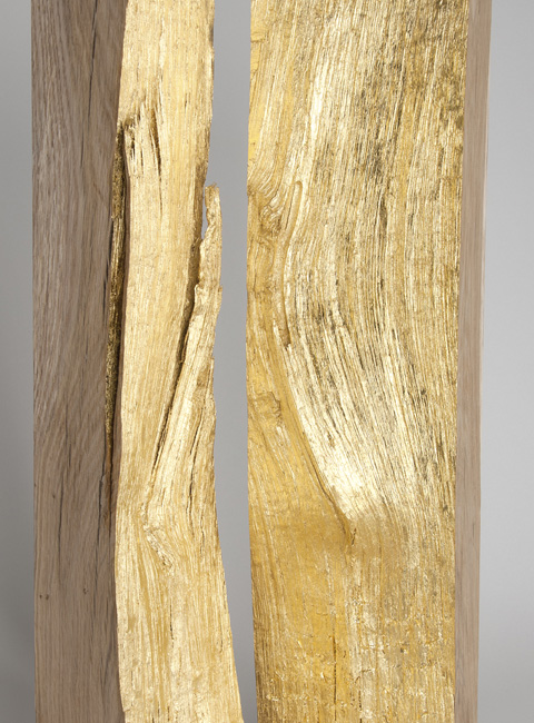 Nous révélant sa substance, l’artiste recouvre, pour mieux le décrire, avec la finesse de la feuille d’or, le bois ainsi révélé.