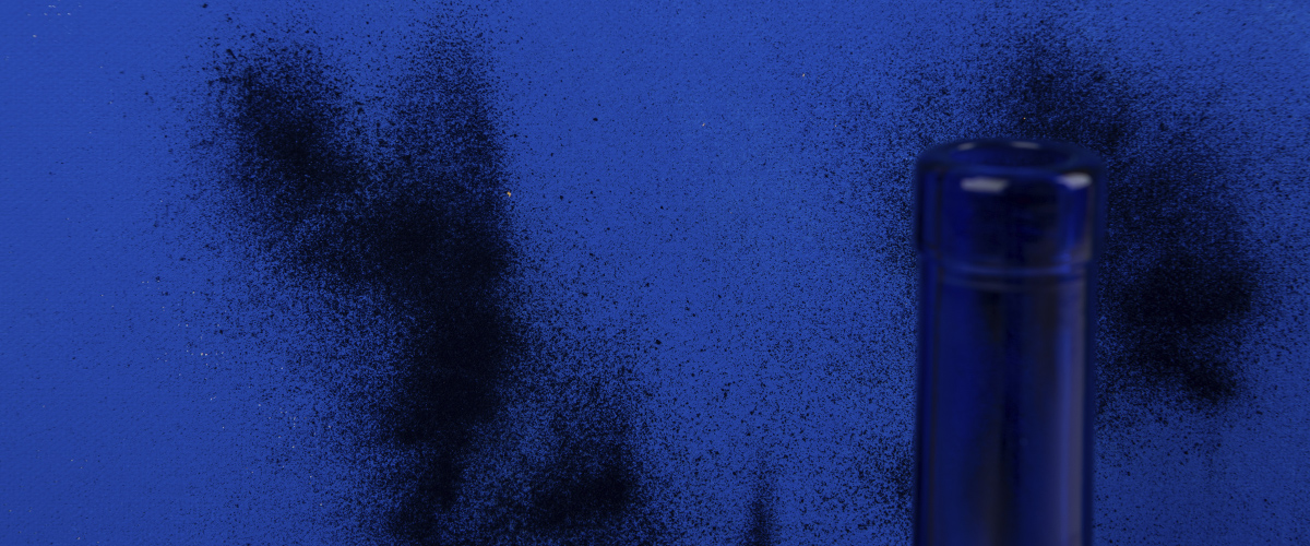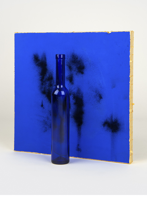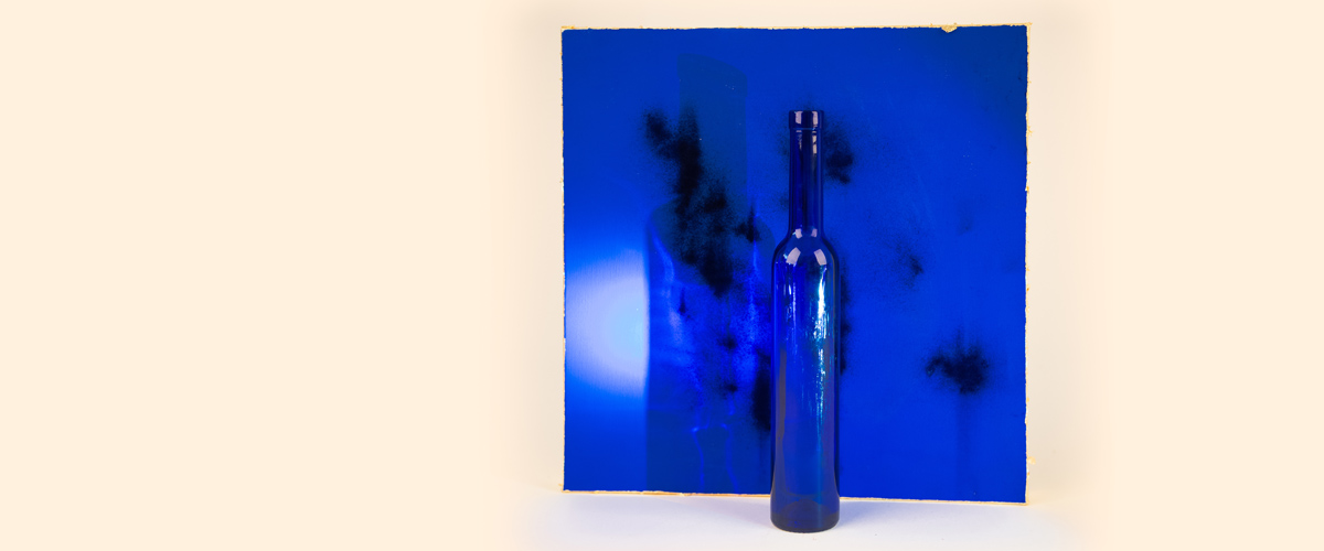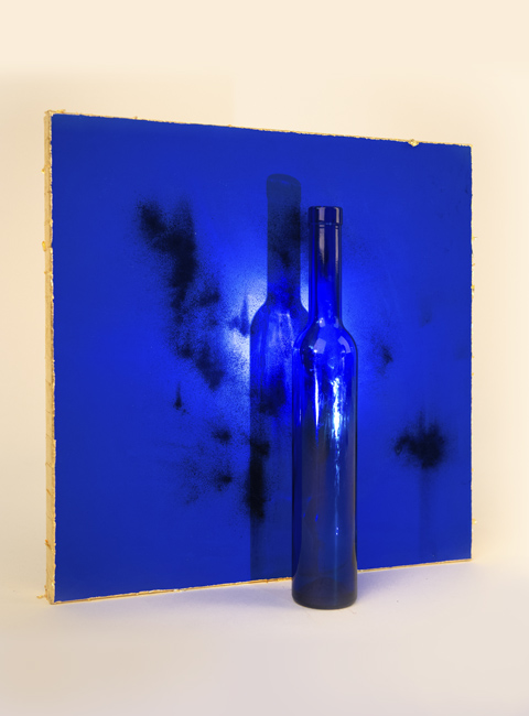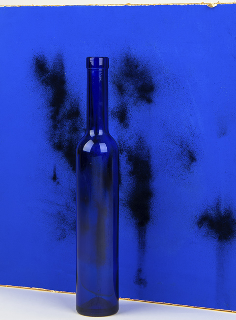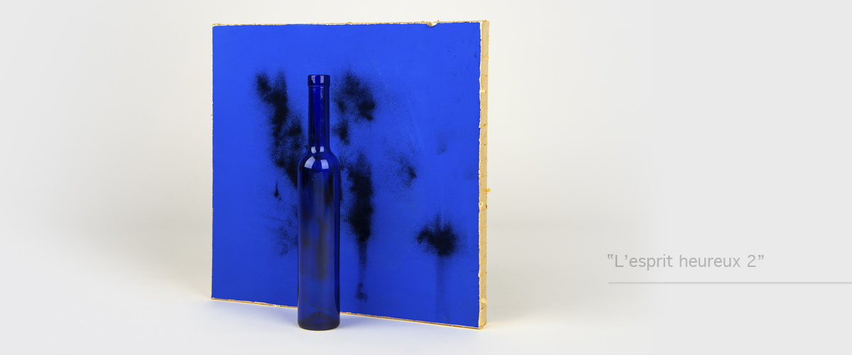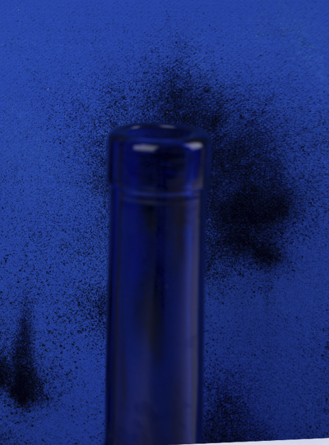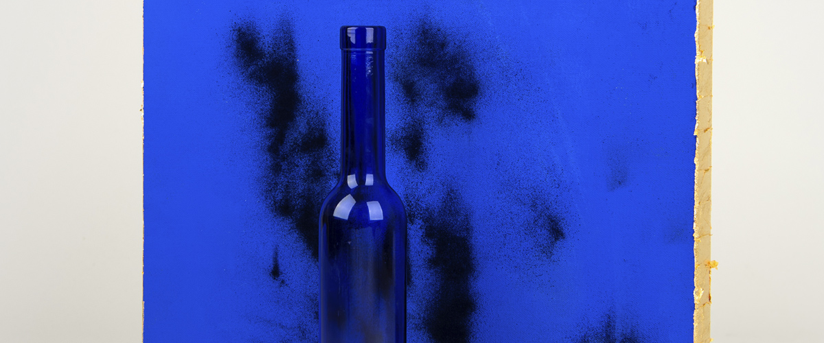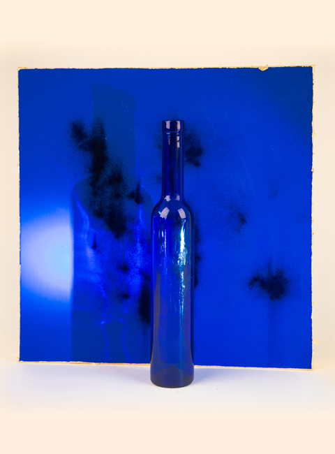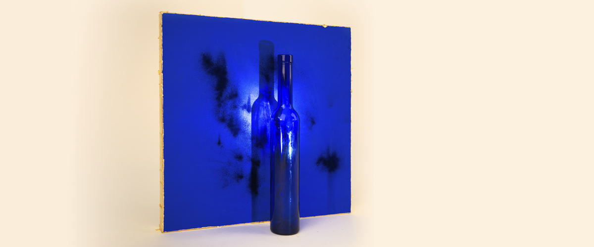 Semblable à la partie bleue au bas d’une flamme, dans la zone de combustion, la bouteille azur est ici le trait d’union entre la mèche (matière) et la flamme (immatérielle), laissant derrière elle, sur la toile de lin, les empreintes dorées de son existence vacillante…