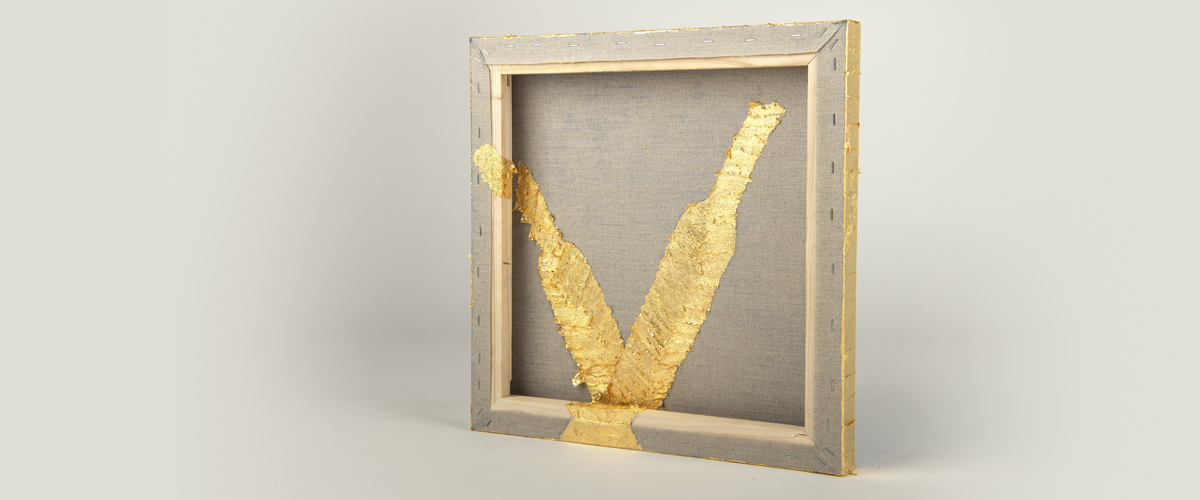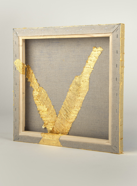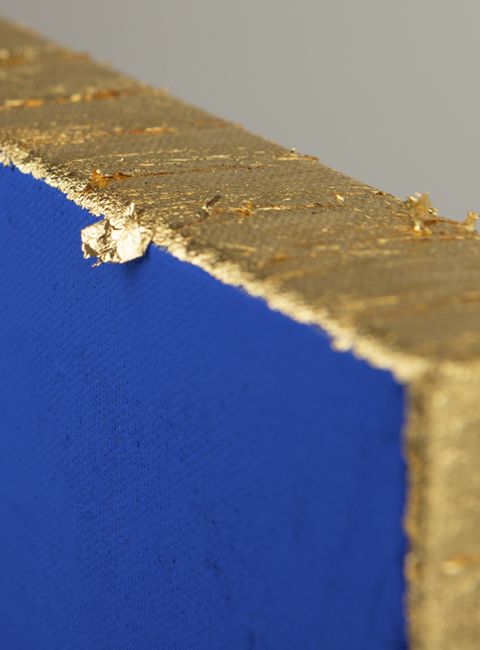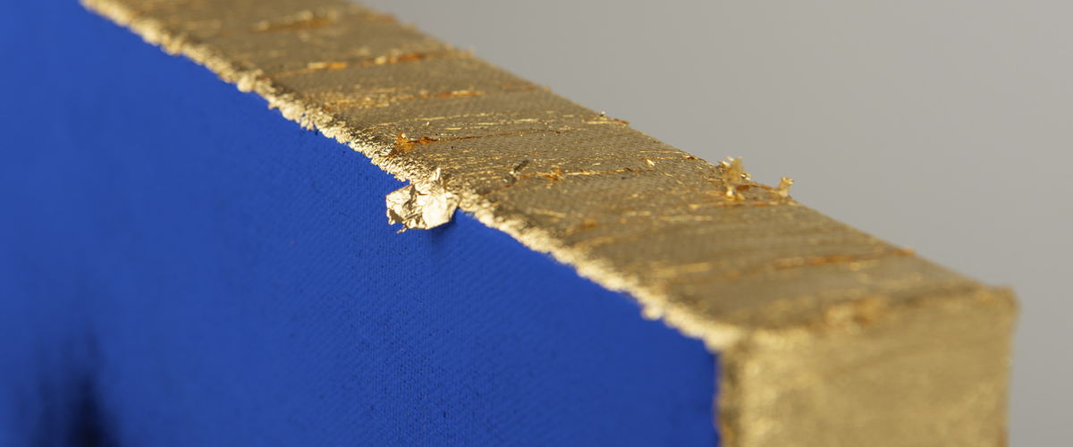 Toiles de lin, pigment, bouteilles bleues, feuille d’or (23,75 Carats)