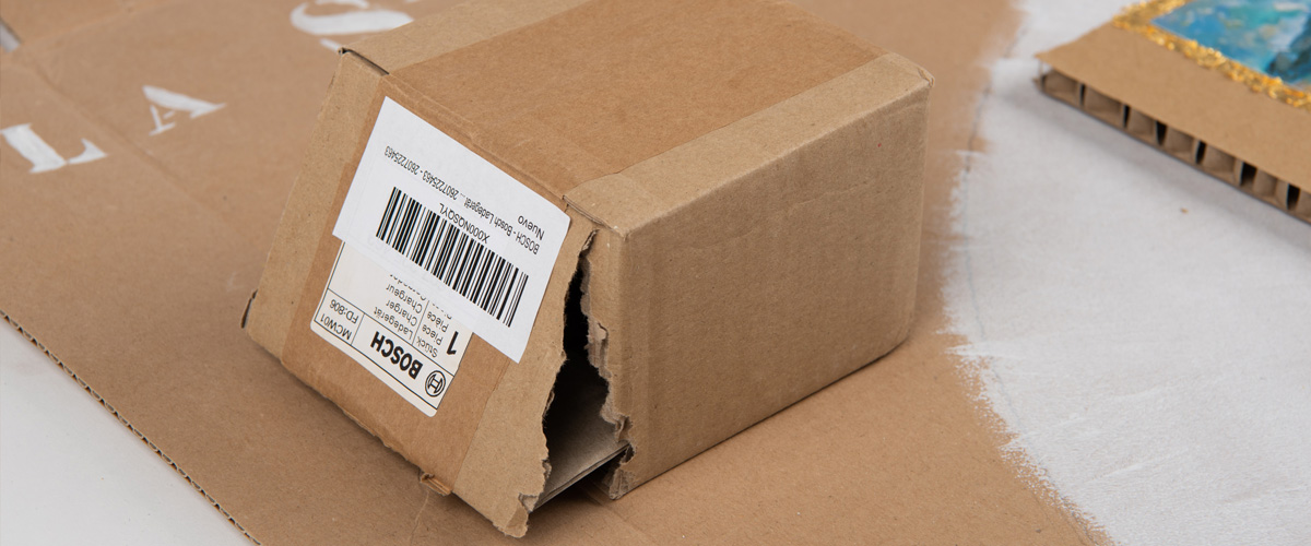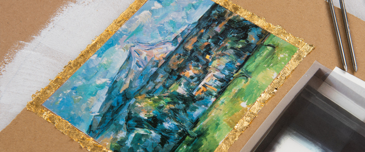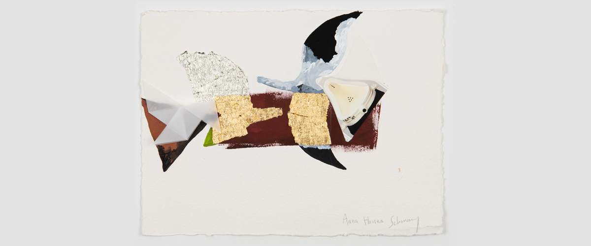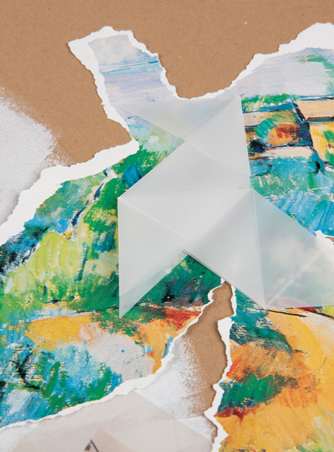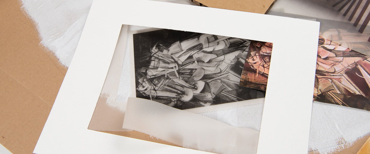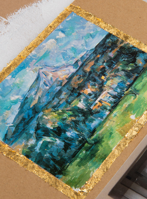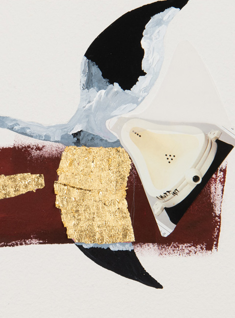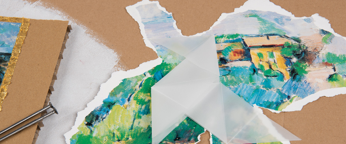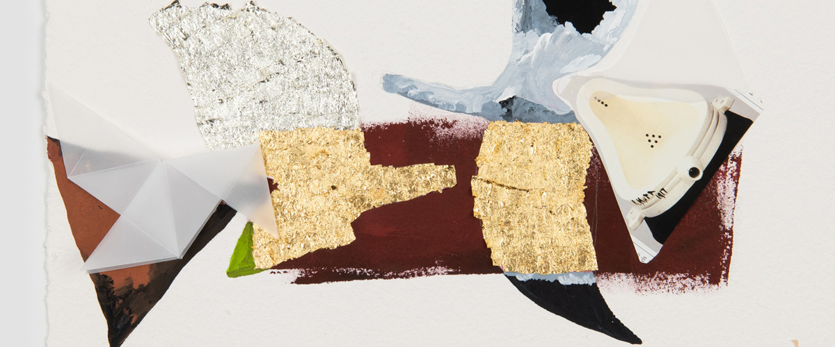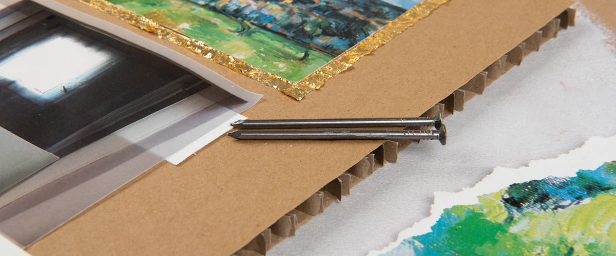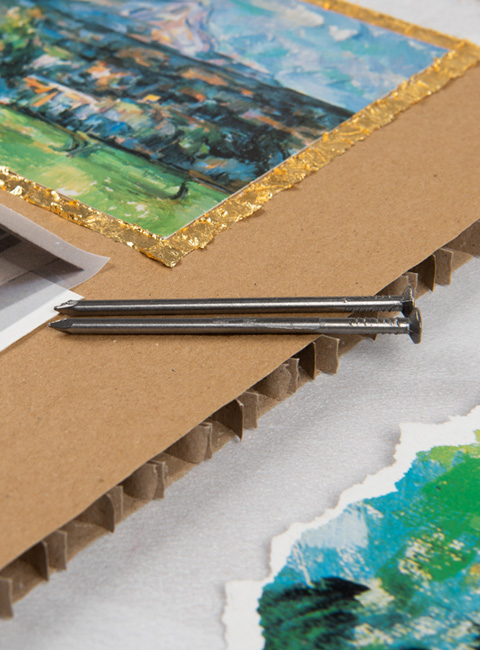 Collage de feuille d’or, feuille de calque et carte postale. Clous et scotch sur carton.