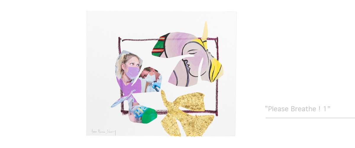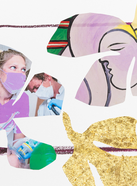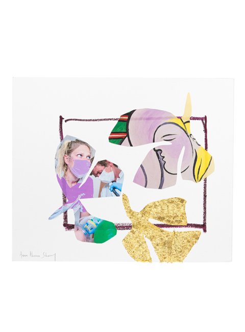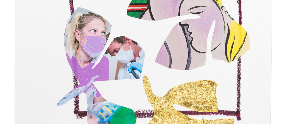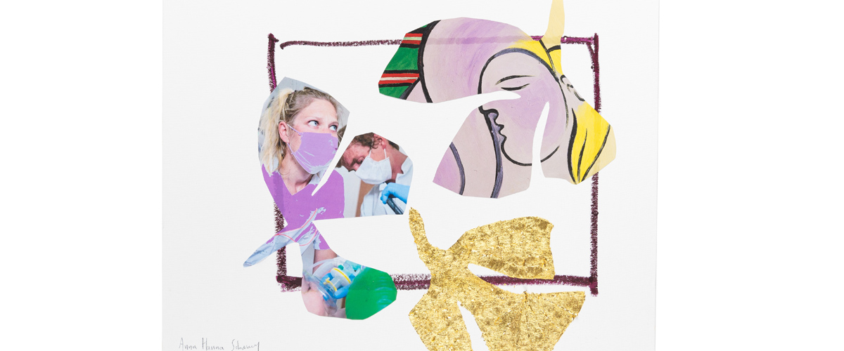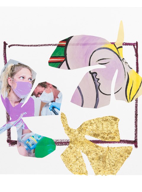 Le cadre en craie grasse n’est jamais complètement fermé. Les papiers découpés représentent les regards croisés entre Sylvette David* (représentée par Picasso été 1953) et Flavie Mélendez, infirmière héroïne d’un monde qui étouffe.