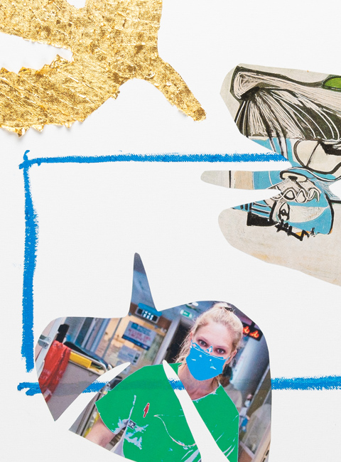 Le cadre en craie grasse n’est jamais complètement fermé. Les papiers découpés représentent les regards croisés entre Sylvette David* (représentée par Picasso été 1953) et Flavie Mélendez, infirmière héroïne d’un monde qui étouffe.