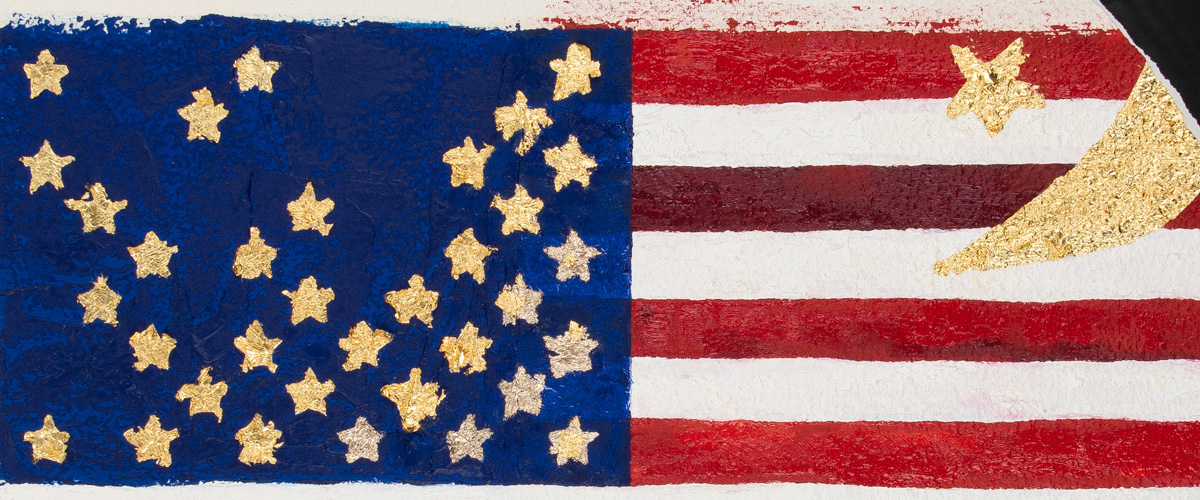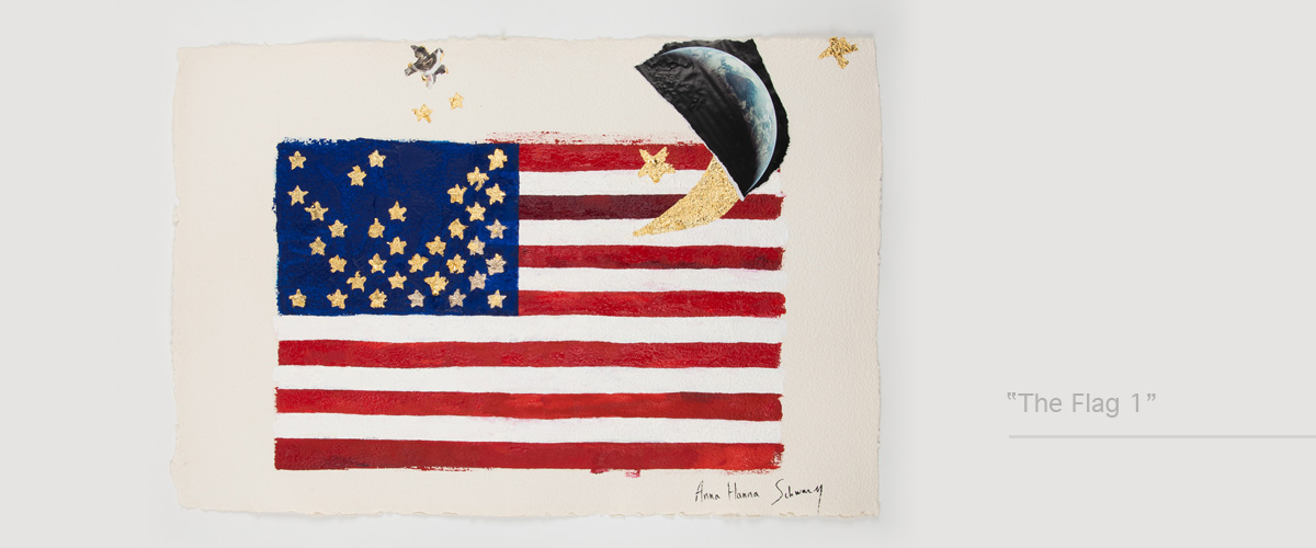 Sur l’étoile du haut se reflète la visière dorée de l’astronaute sur laquelle se reflète encore le décor de la lune et du drapeau comme une mise en abyme.
