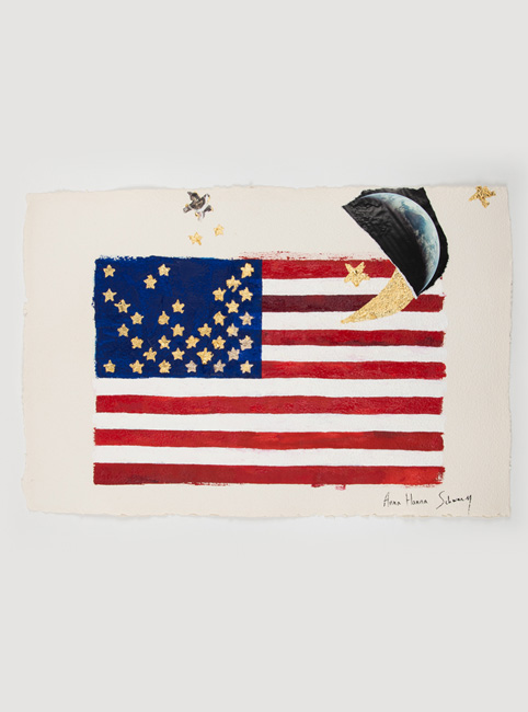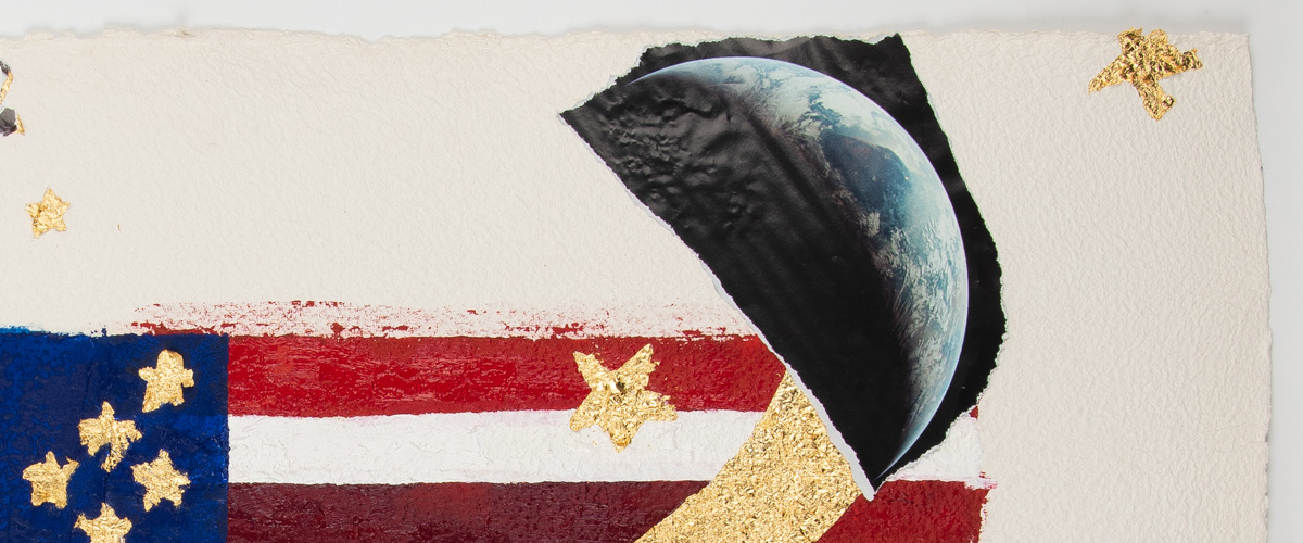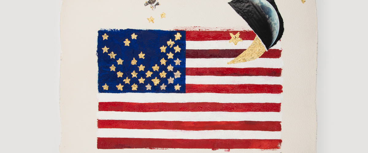 The upper star reflects the astronaut’s golden visor, reflecting inside the moon landscape and the flag like a mise en abyme.