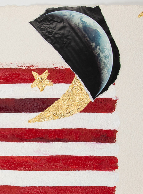 Par la feuille d’or et le collage représentant un clair de terre, la lune et la terre se rejoignent et s’unissent enfin dans un même mouvement.