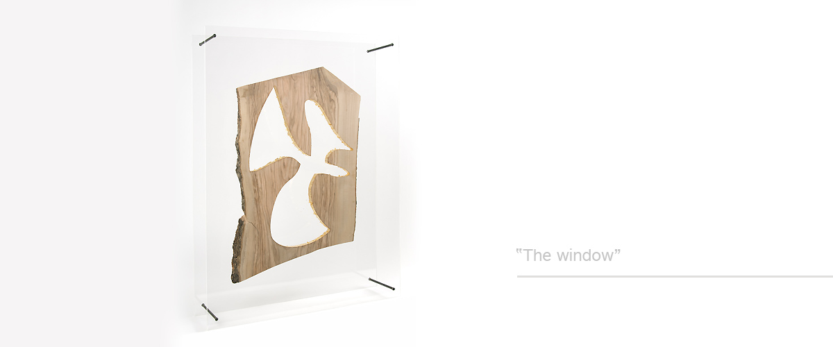 In “The Window” work of art, the olive wood board, like a stencil, turn into an opening through which we can see an endless window beyond.