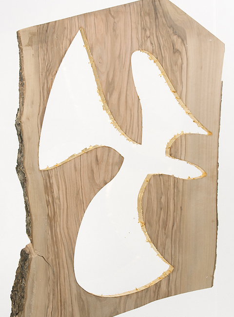 Le bois d’olivier, part la brûlure du laser, exprime l’oiseau-colombe qu’il contient.