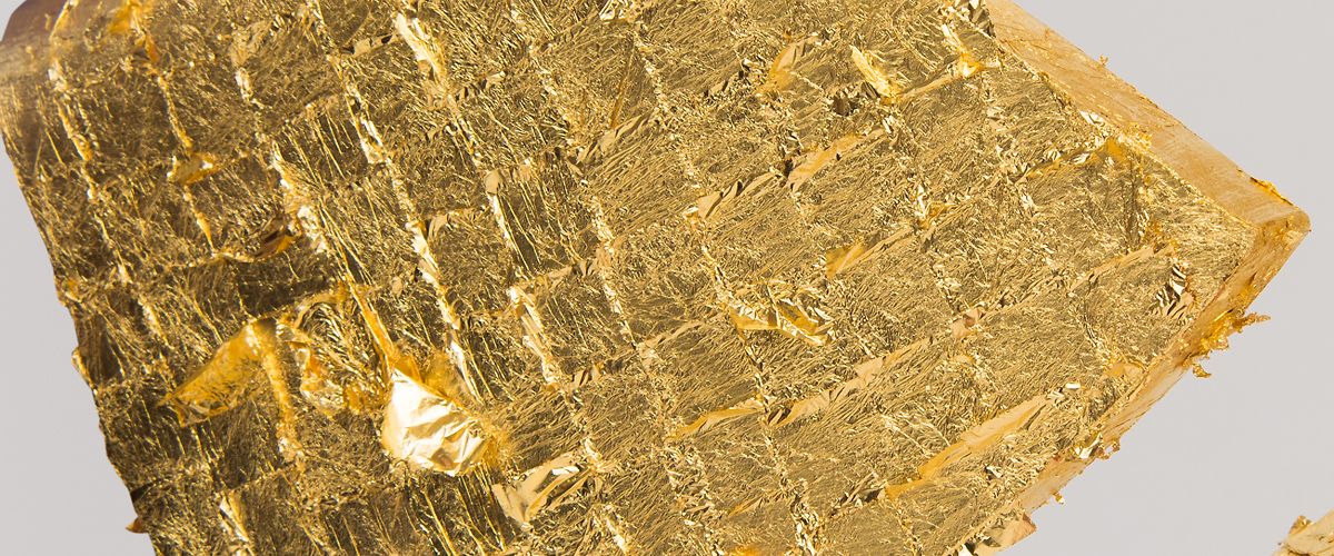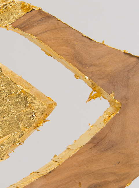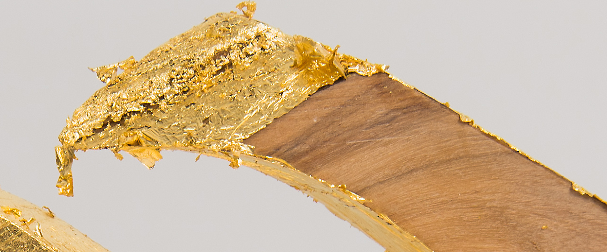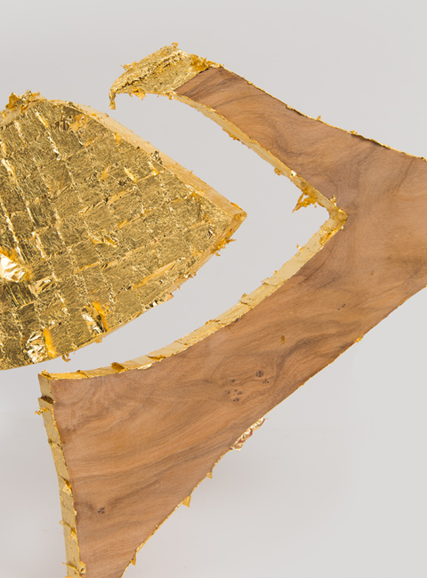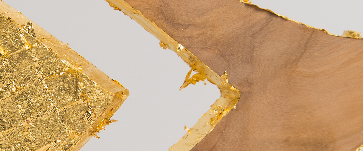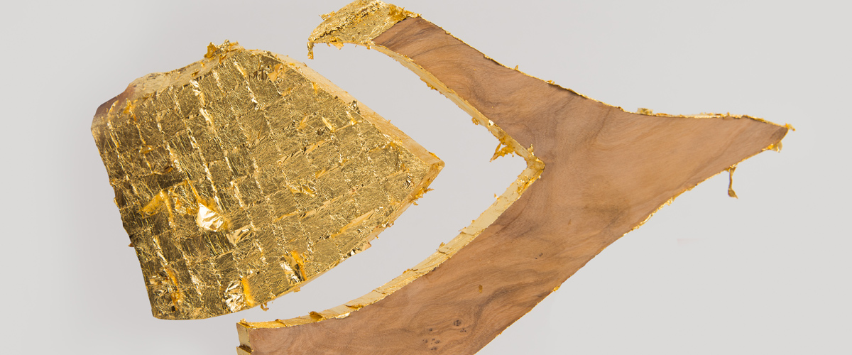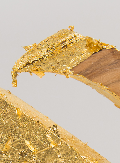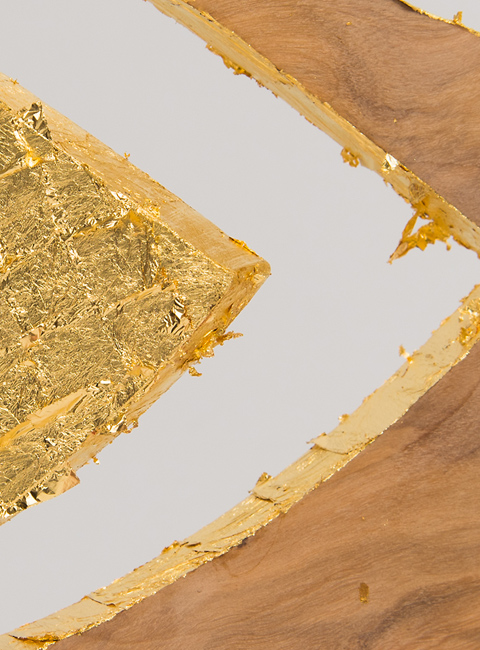 Feuille d’or sur bois d’olivier et découpe double : laser (feu) et eau sous pression