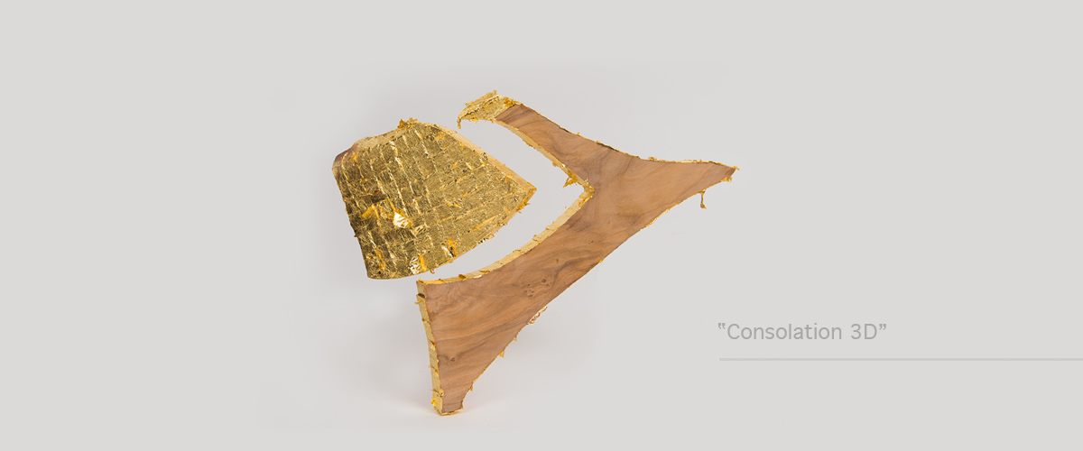Here, the olive wood, powerful symbol of peace, contains at last this alliance between fire and water. Indeed, « Consolation » is a piece of work with a double cut : cutting by the fire of the laser on part of the sculpture and cutting by high pressure water jet of 5000 bars.