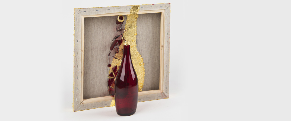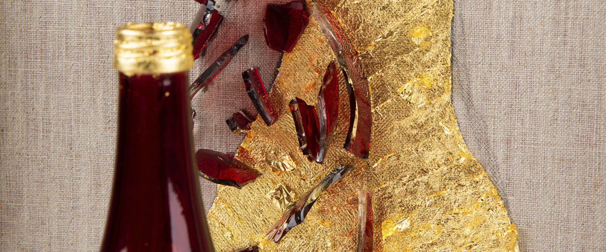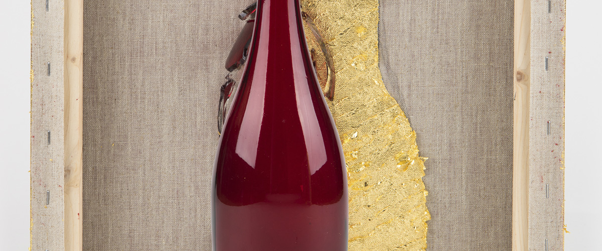 Toiles de lin, pigment, bouteilles rouges, feuille d’or (22 carats)