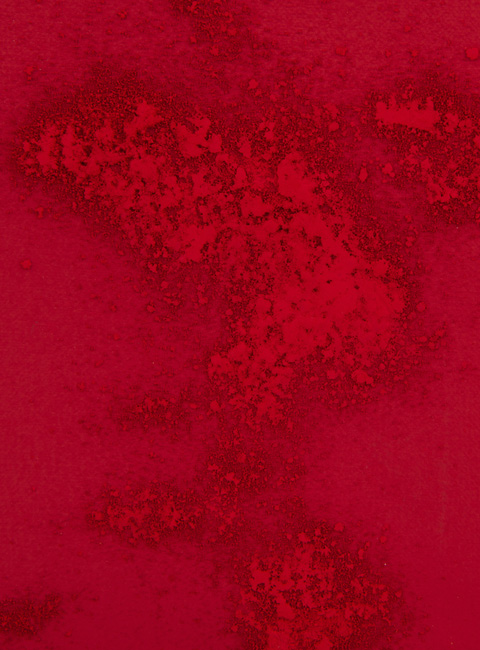 The linen frame with a red pigmentation, like a mirror between the colored bottles, stands here, as the witness of an ardent appetite, never full, as the scarlet shadows of the matter.