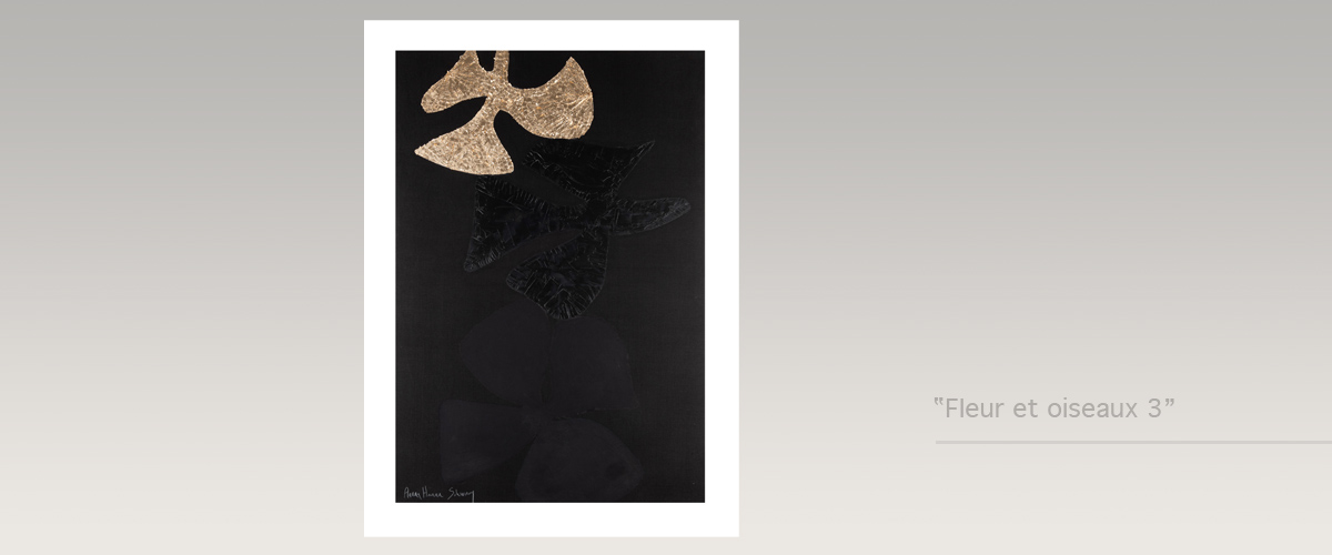 L’absorption des noirs sur le lin teint de noir, renouvelle cette expression d’une matière devenue immatérielle, ne laissant sur le support que l’essence sourde de son existence, favorisant ainsi la présence conquérante de la matière : l’oiseau ardent, Moon Gold.