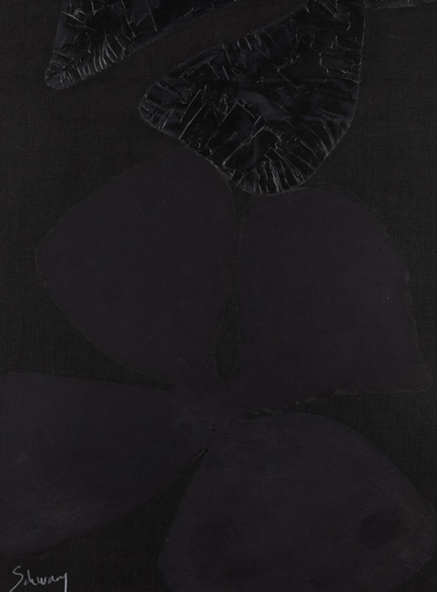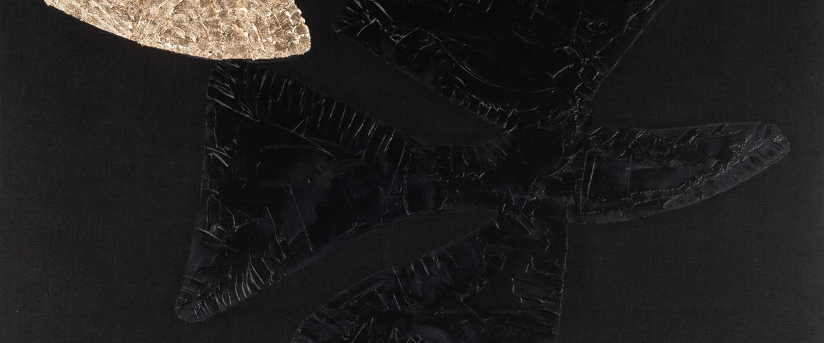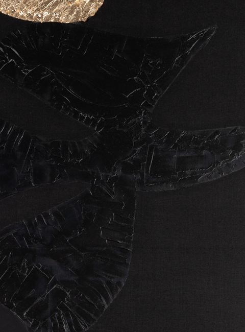 The absorption, black on black linen is a renewal of a matter that turns into immaterial, leaving on the medium the unresponsive essence of its existence, fostering the winning spirit of the matter: scorching bird, Moon Gold.
