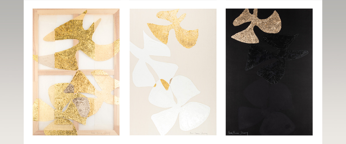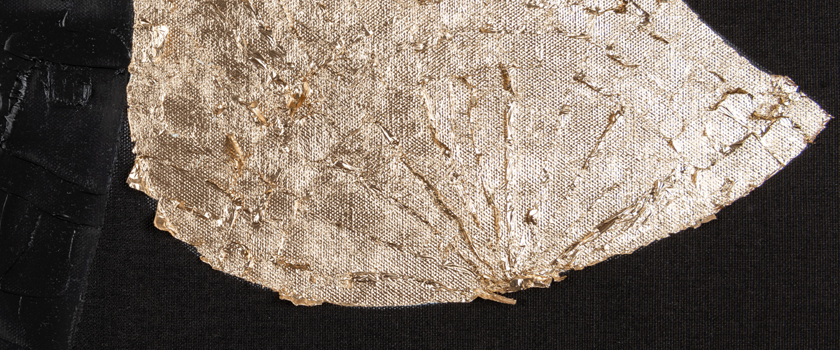 Huile et gouache, feuille d’or sur coton tarlatane transparent, sur lin naturel et sur lin noir.