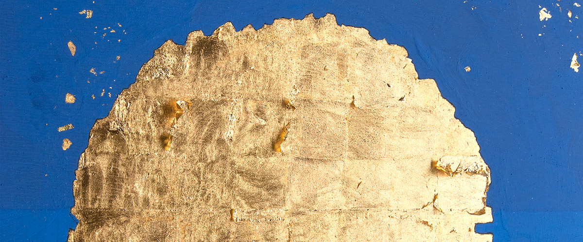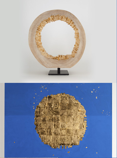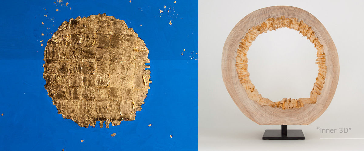 La représentation en 2D de l’intérieur du tronc, comme l’ombre portée du vide, redessinée à l’identique et chargée de feuille d’or (23,75 C) exprime toute la densité lumineuse du dedans.
