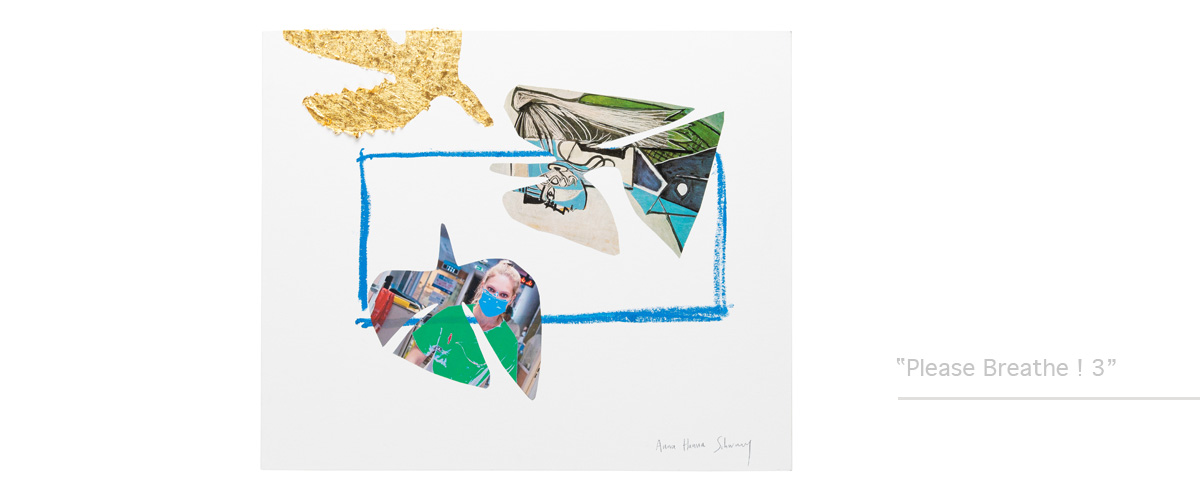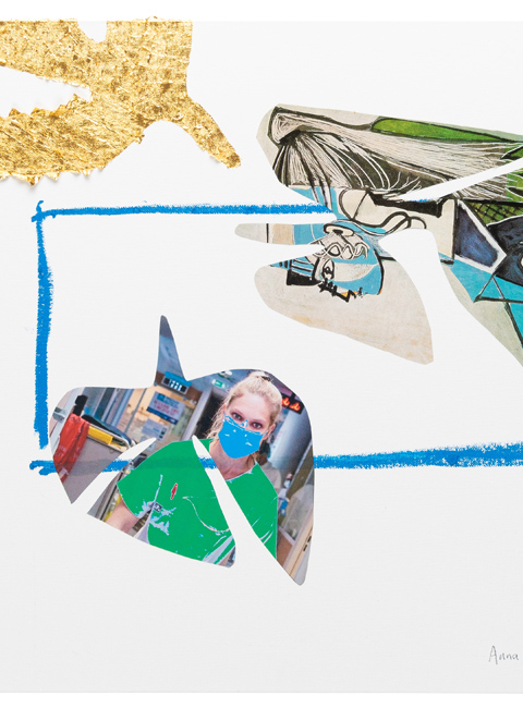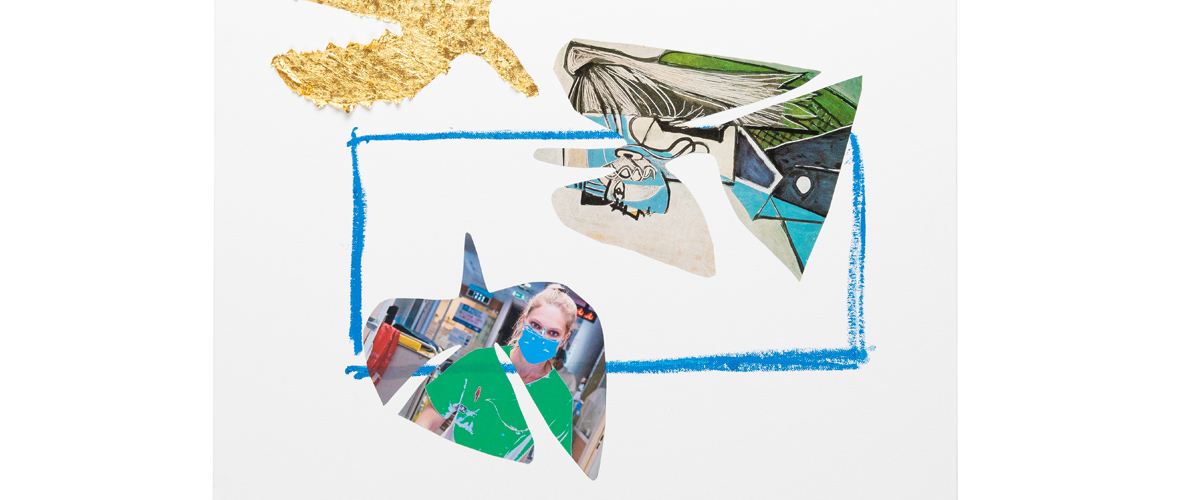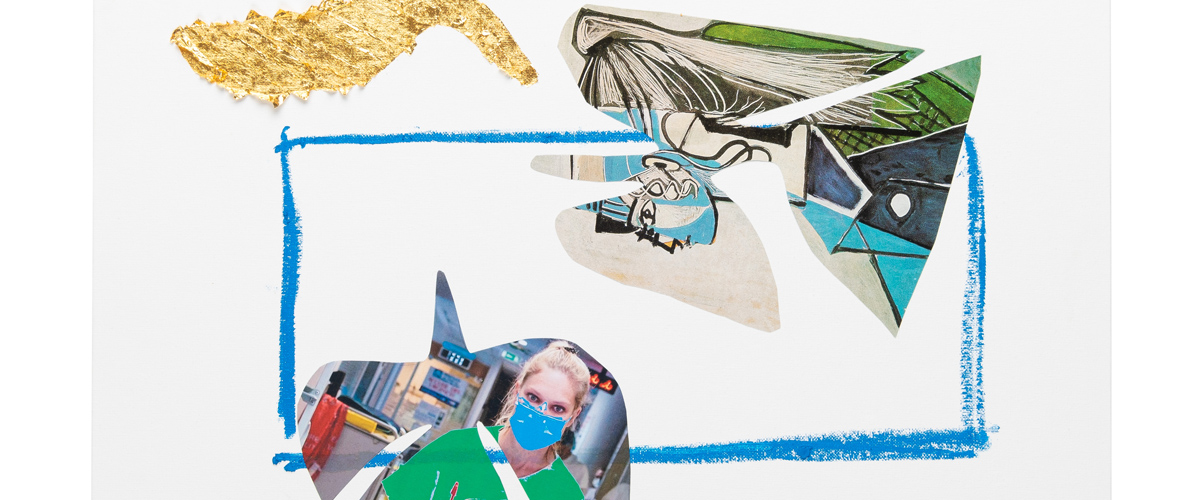 Le cadre en craie grasse n’est jamais complètement fermé. Les papiers découpés représentent les regards croisés entre Sylvette David* (représentée par Picasso été 1953) et Flavie Mélendez, infirmière héroïne d’un monde qui étouffe.