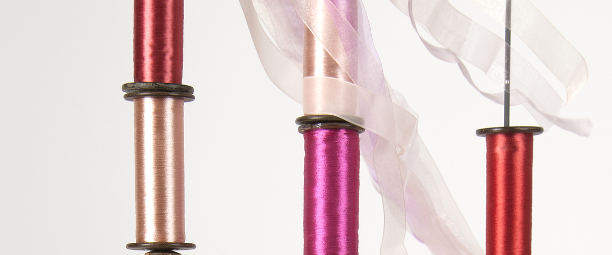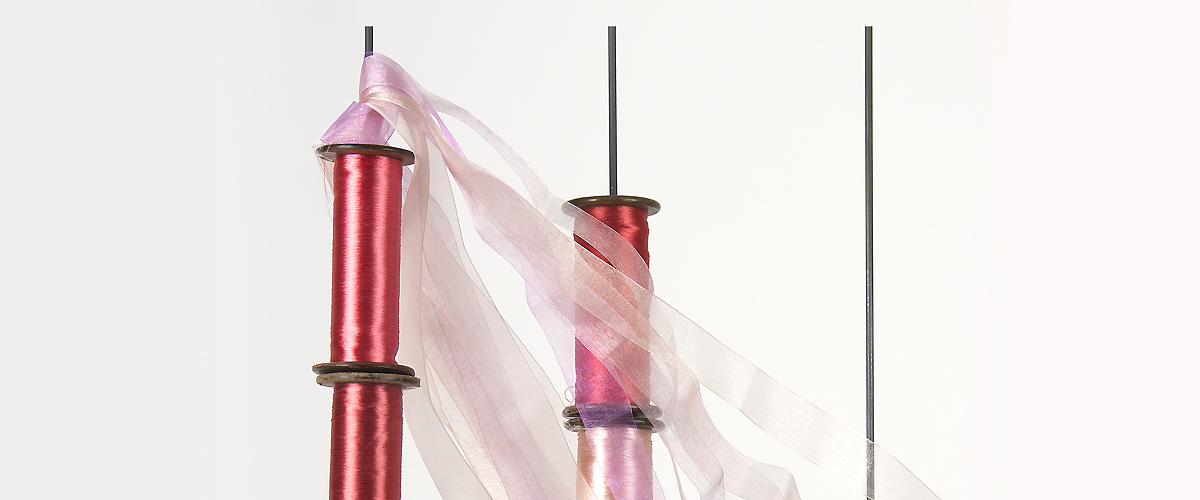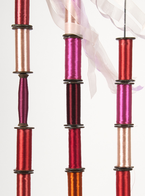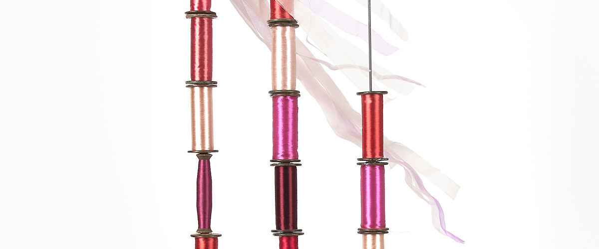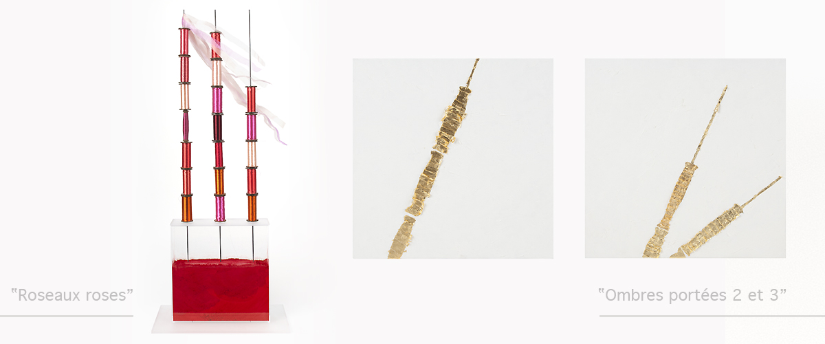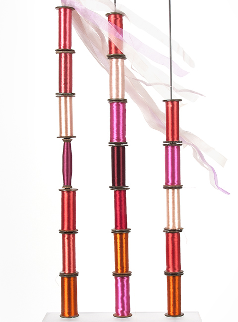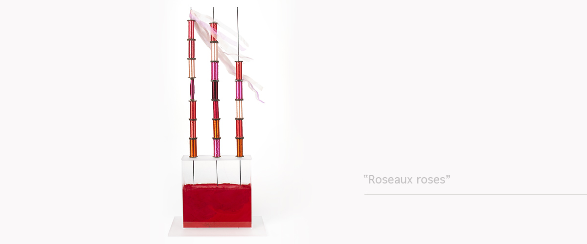 Le terreau est représenté par le pigment de couleur qui donnera l’ADN à la matière qui s’y développera. Les cordes de piano, comme les tiges des roseaux qui se plient à la mélodie du vent, portent les bobines de fils colorés, instruments de la création. A l’extrémité des tiges volent les rubans de couleurs, témoins joyeux et dansants de cette mélodie.