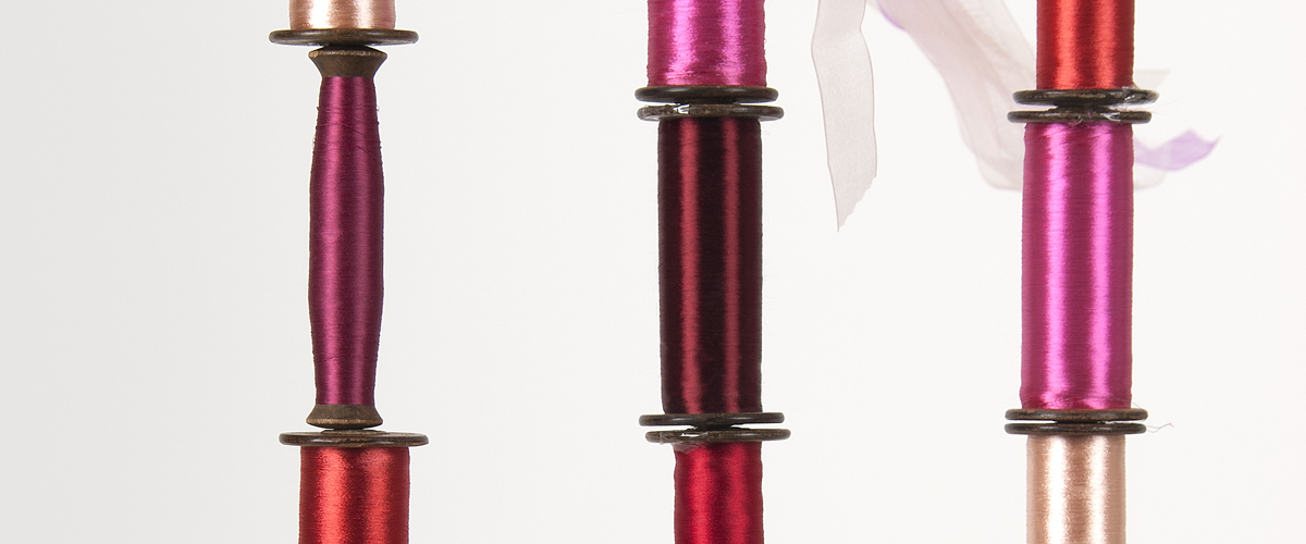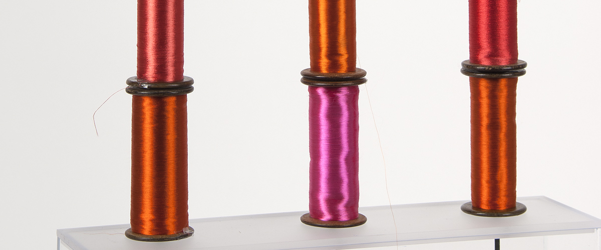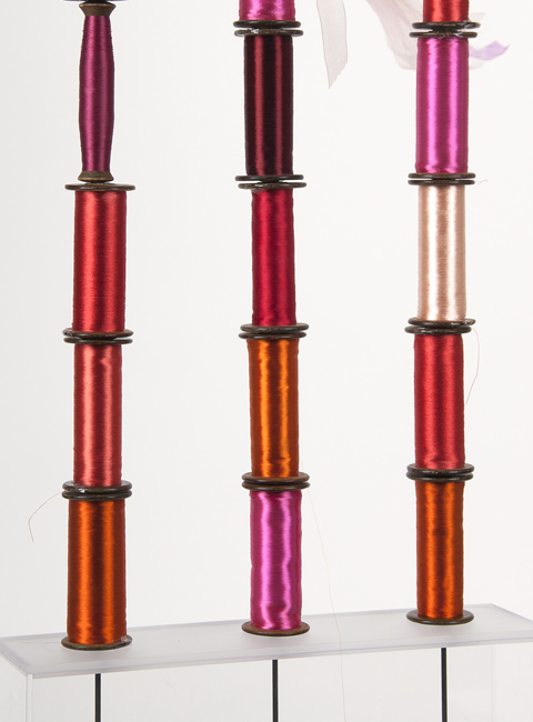 Original rose 1900 spools of thread, piano strings, plexiglas box and blue pigment.