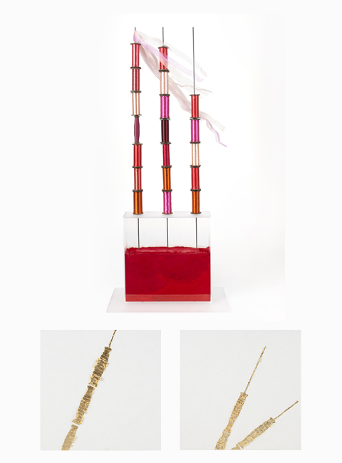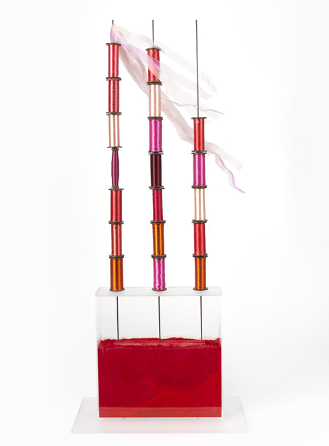 Bobines de fil rose, cordes de piano, boîte en plexiglas et pigment rouge