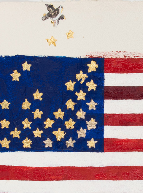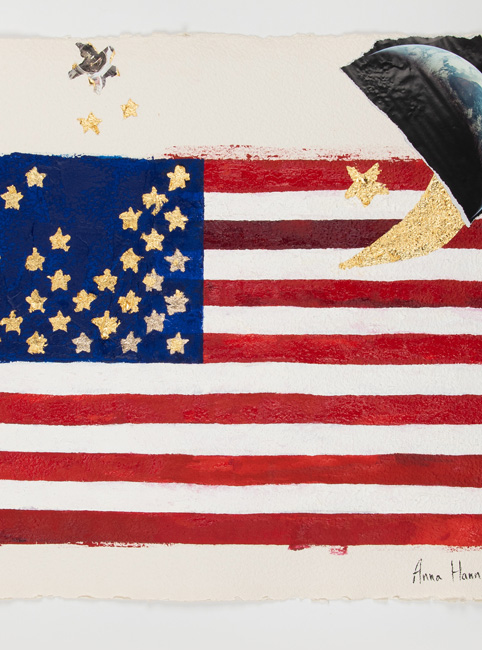 The upper star reflects the astronaut’s golden visor, reflecting inside the moon landscape and the flag like a mise en abyme.
